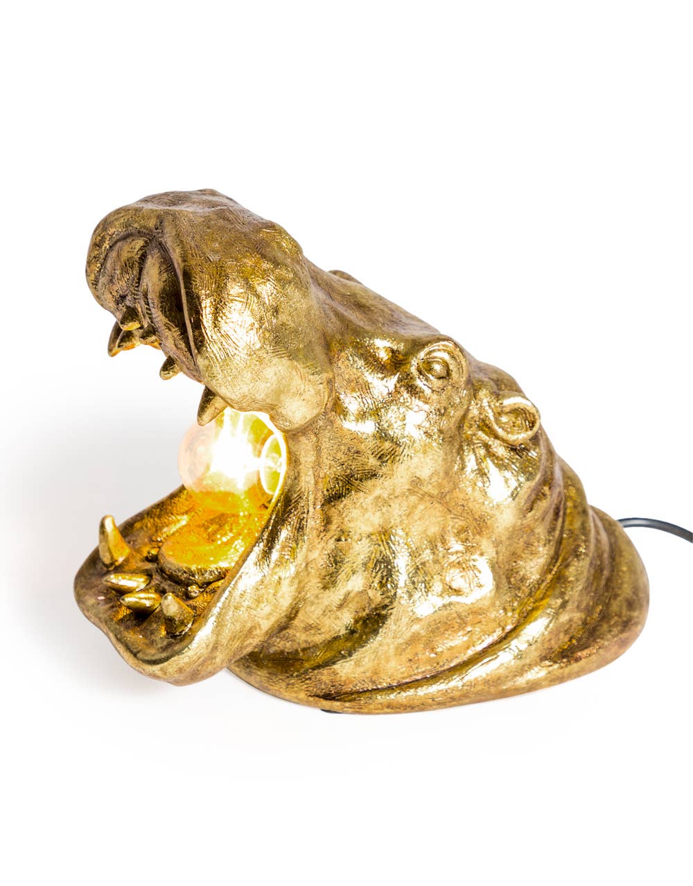 Antique gold roaring hippo table lamp. This guy is so funky ready to illuminate literally any space. Reading nook to office this light could fit into any environment. Beside your favourite chair for reading or maybe a desk lamp. Anyone who loves all creatures great and small will love our fantastic hippo lamp. All hippo fanatics will love this guy.